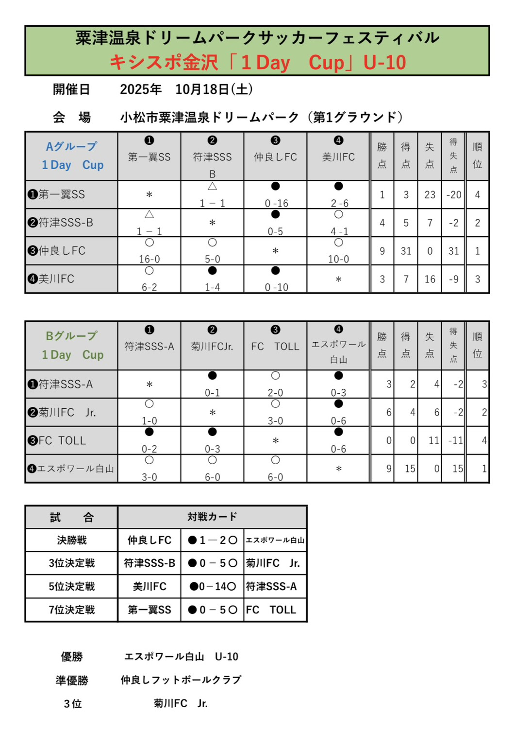 10月18日(土)キシスポ「1 Day Cup」 U-10 in 粟津温泉ドリームパークが開催されました!!