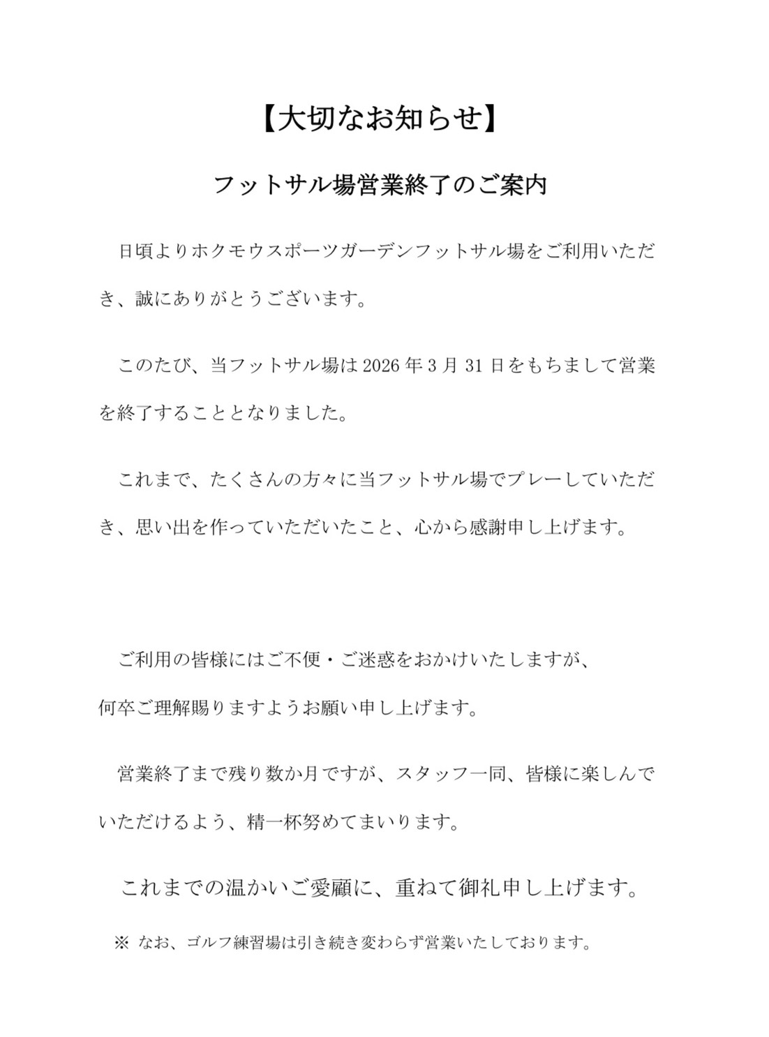 【大切なお知らせ】ホクモウスポーツガーデン(フットサル場)営業終了のお知らせ