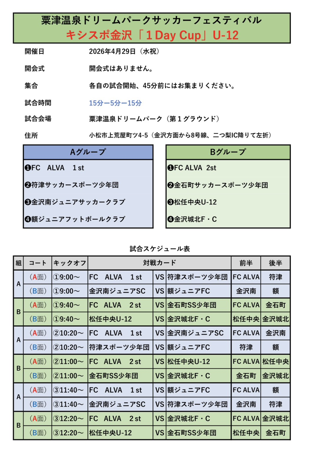 4月29日(水祝)キシスポ金沢「1DayCup」の組合わせや日程を報告させていただきます。 会場は粟津温泉ドリームパーク第1グラウンドです。観戦無料ですので、ぜひお越しください。 4月29日(水祝)キシスポ金沢「1DayCup」開催!