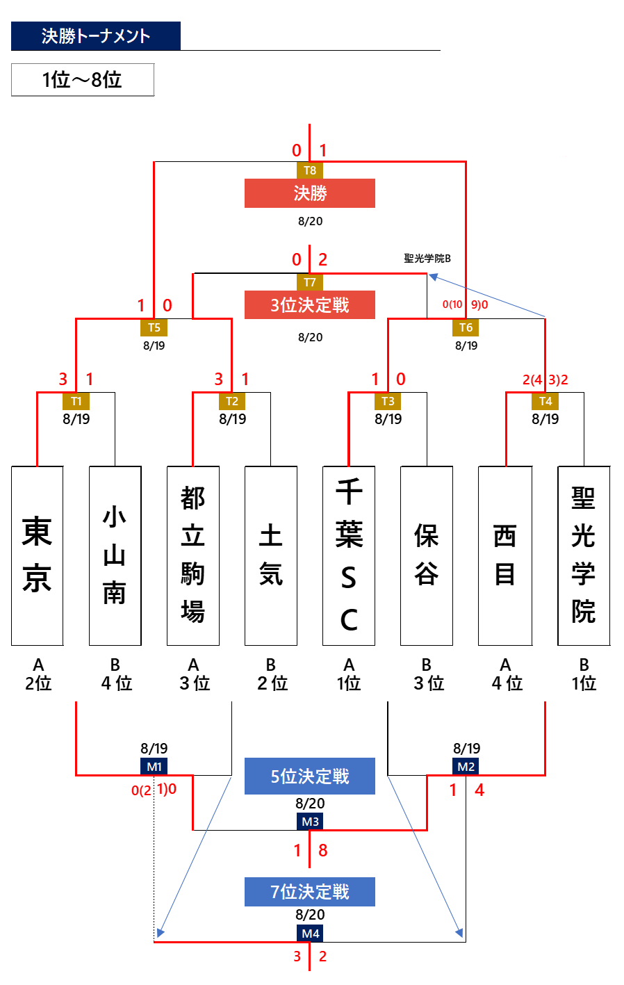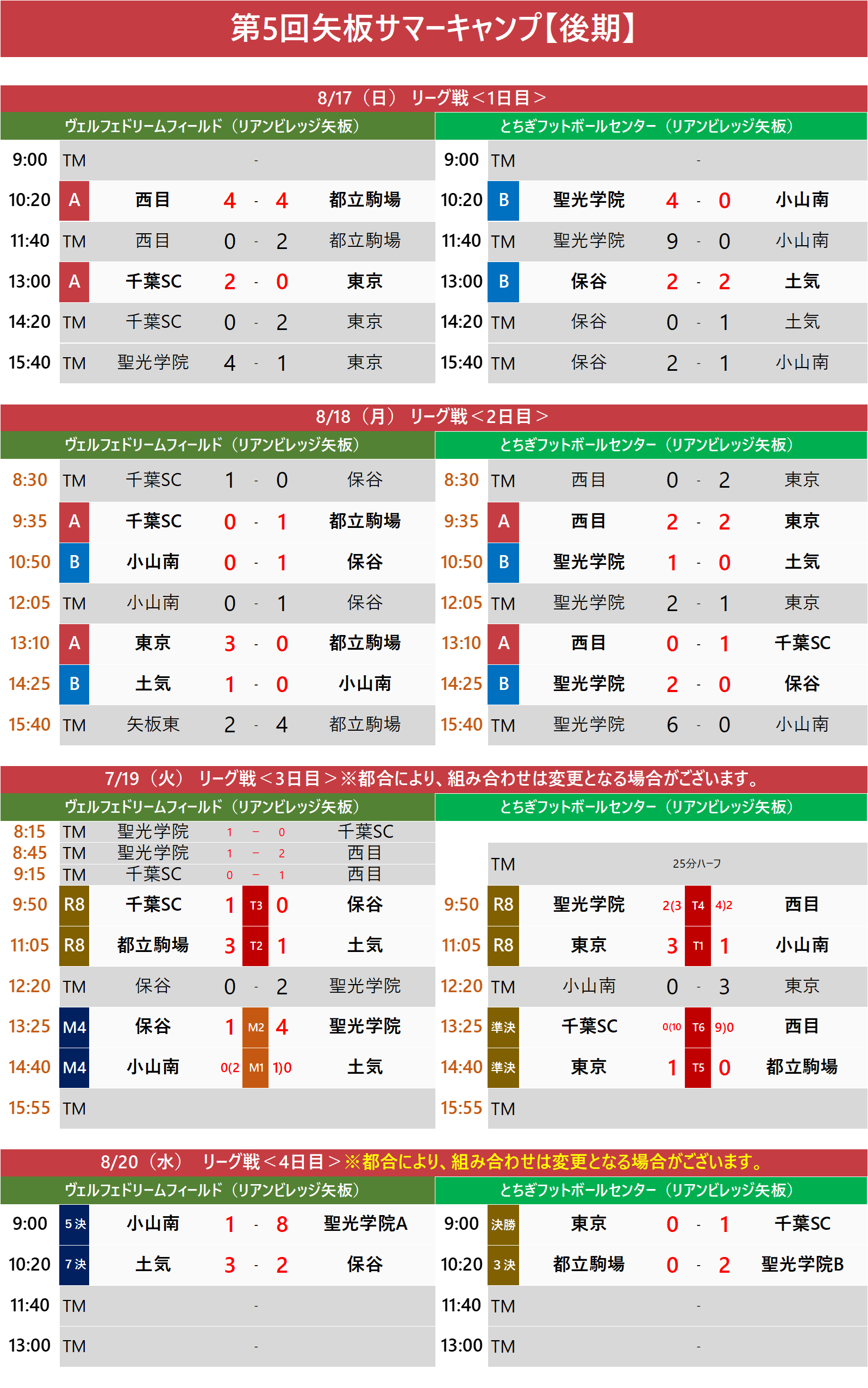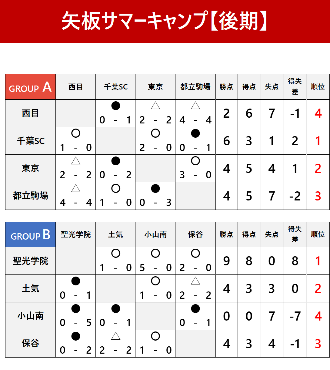 矢板サマーキャンプ【後期】 優勝 千葉サッカークラブU-18 準優勝 東京高校 第3位 聖光学院高校(西目高校) ※西目高校が一足早く学校が始まるため、聖光学院高校が代わりに最終日を戦いました。 リーグ戦表 スケジュール トーナメント表