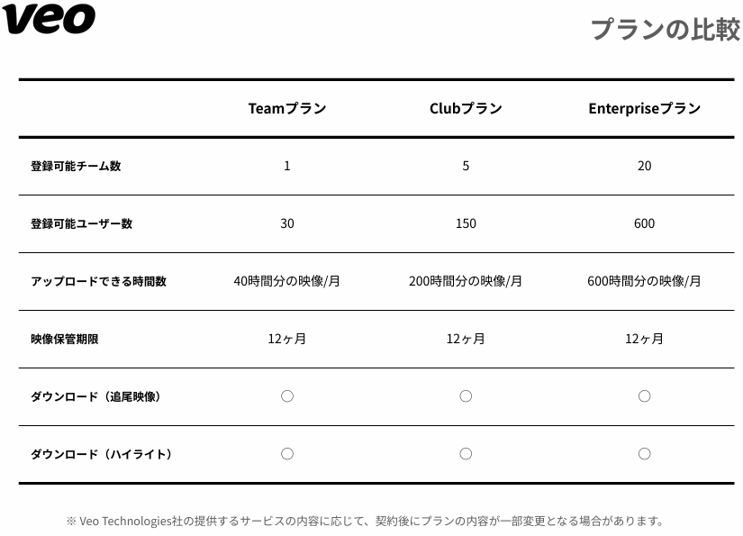A.1つのveo3 で登録可能なチーム数や、1ヶ月の映像アップロード可能時間に違いがございます。